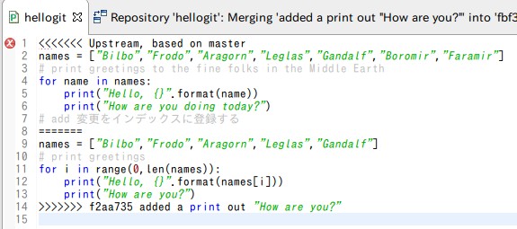Merge Toolが起動しましたが、hellogit.pyを直接編集することにします。
